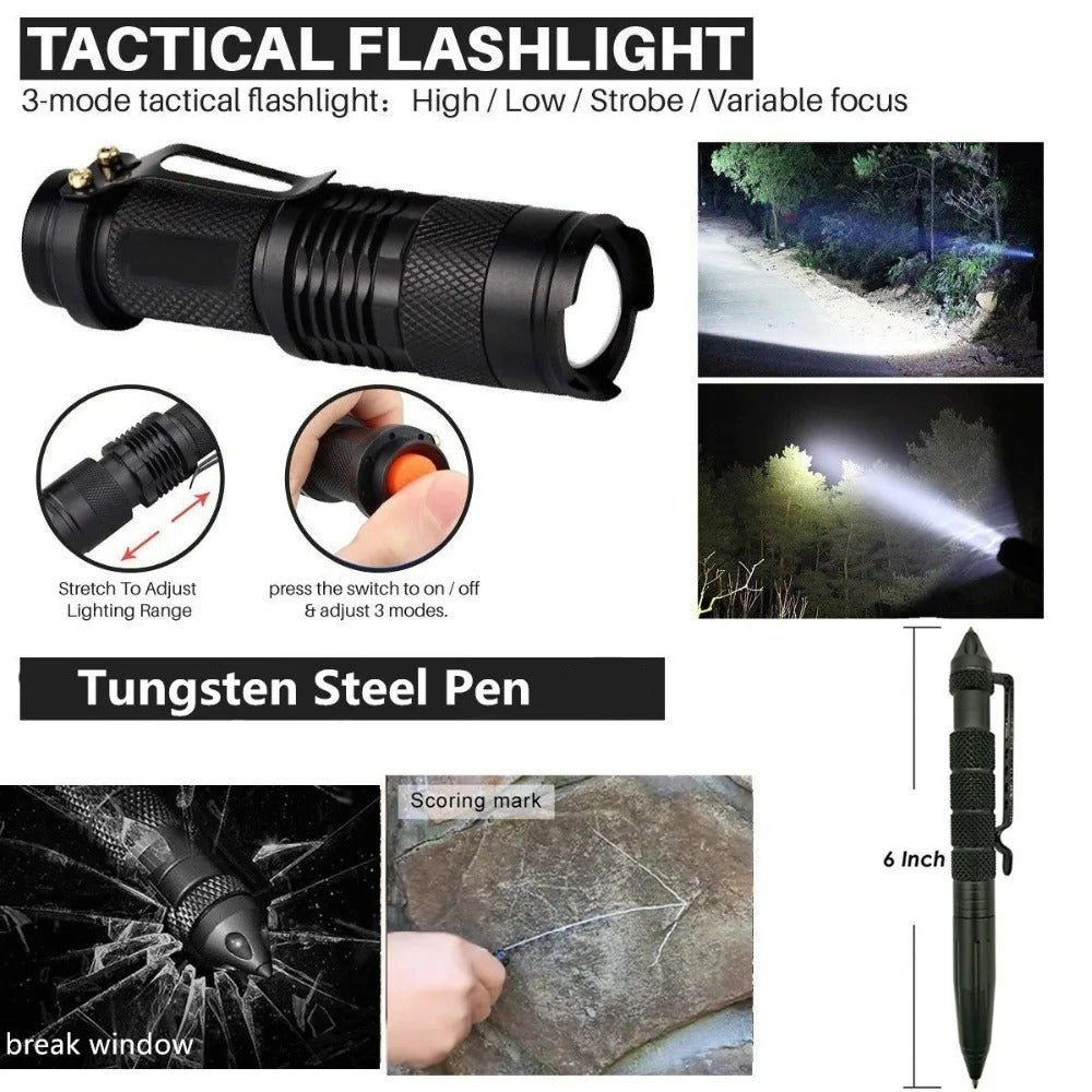 - Boîte de survie : Boussole , Bracelet de survie en paracorde 5 en 1 , Couteau à carte de crédit: taille carte de crédit 11 fonctions, couteau de survie de haute qualité, Stylo tactile robuste avec pointe en carbure , Couverture d'urgence , Lampe de poche , Scie à fil , Clip de bouteille d'eau, sifflet ..