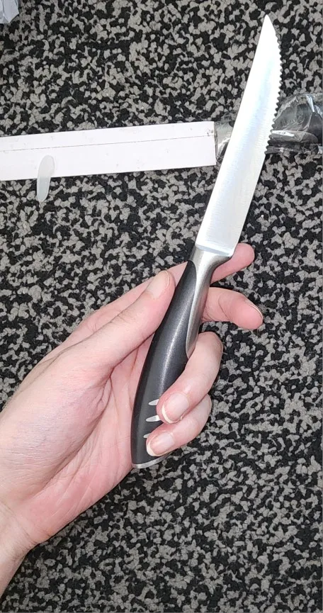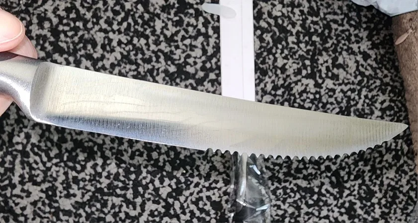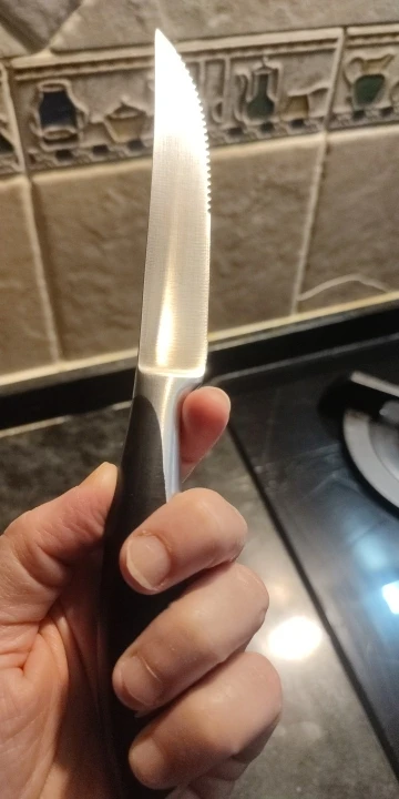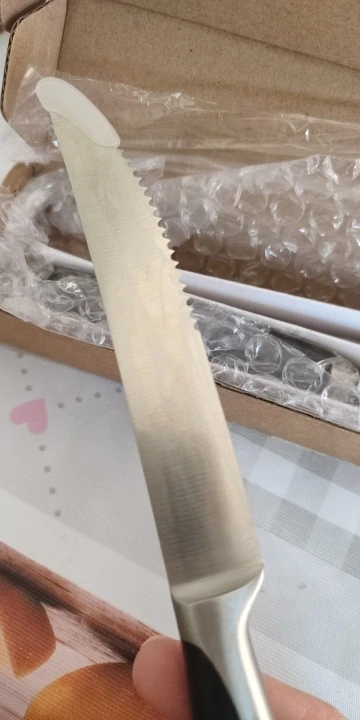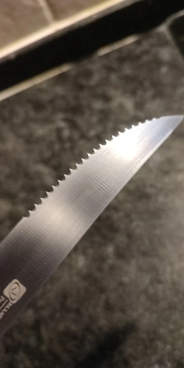 J'espérais que la lame soit cranté tout du long comme sur l'image principale mais je n'avais pas vu les autres photos. La lame est crantée sur une moitié et lisse sur l'autre. Au final, ça ne gêne pas trop car on coupe pas forcément sa viande en utilisant toute la lame. Les couteaux sont en tout cas de très bonne qualité, très agréable à tenir en main et très jolis.